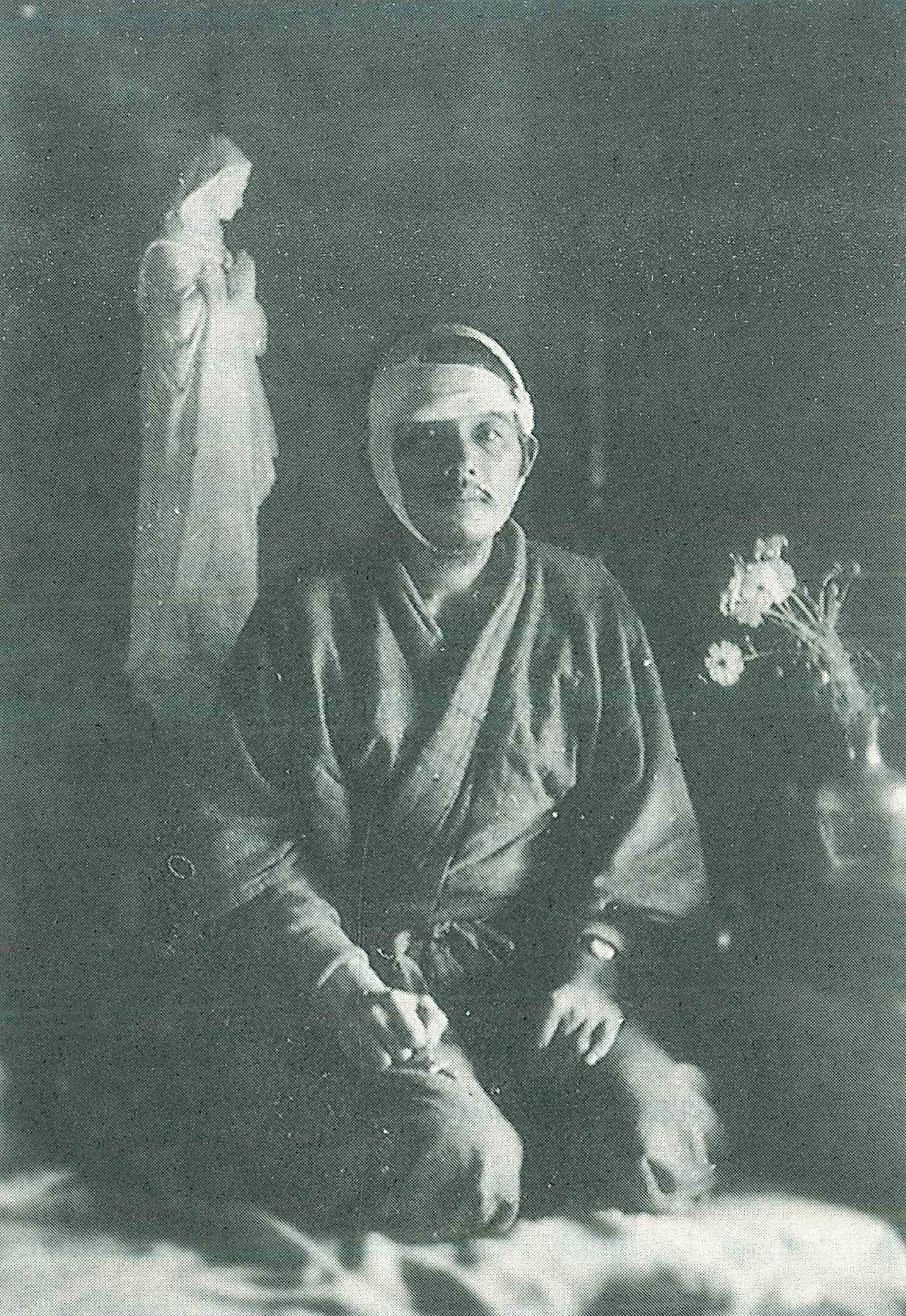 長崎原子爆弾の炸裂後の3日後から長崎医科大学の第11医療隊で、永井隆は被爆者救護の診療をした。永井隆は三ツ山の借家の救護所にて1945年10月頃に撮影された。9月20日頃から原爆病が発現した永井隆は被爆して包帯を巻いて血痕を伴って脱毛も伴って杖を付きながら救護活動をした。